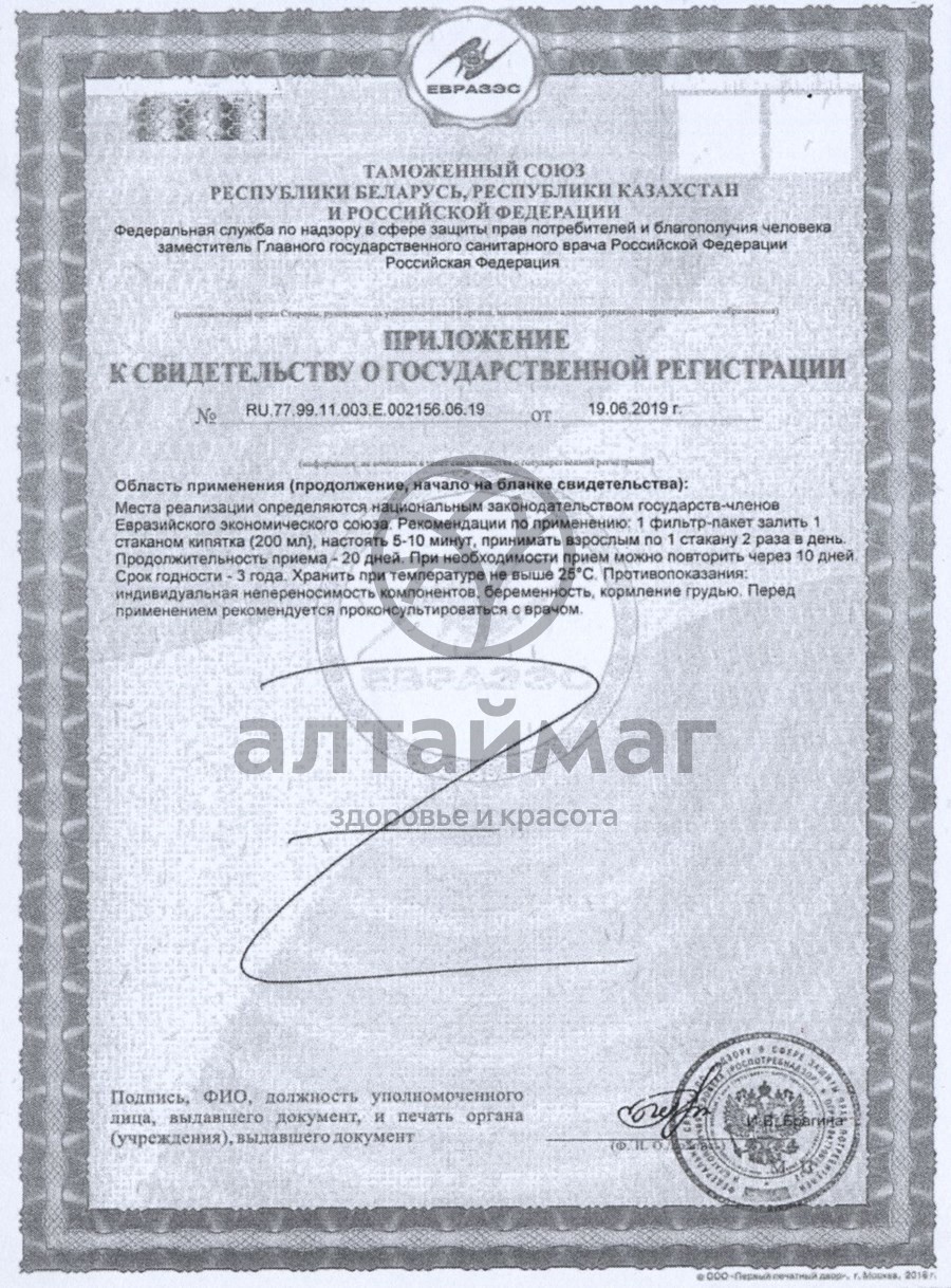 1 фильтр-пакет залить 1 стаканом кипятка (200 мл), настоять 5–10 минут. Принимать взрослым по 1 стакану 2 раза в день. Продолжительность приема - 20 дней, при необходимости через 10 дней прием можно повторить.