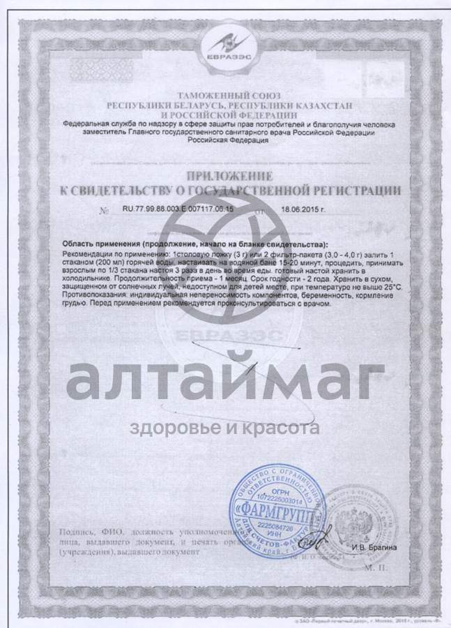 1 столовую ложку россыпи (3,0 г) залить 1 стаканом (200 мл), настоять на водяной бане 15-20 минут, процедить, принимать взрослым по 1/3 стакана 3 раз в день во время еды. Готовый настой хранить в холодильнике.