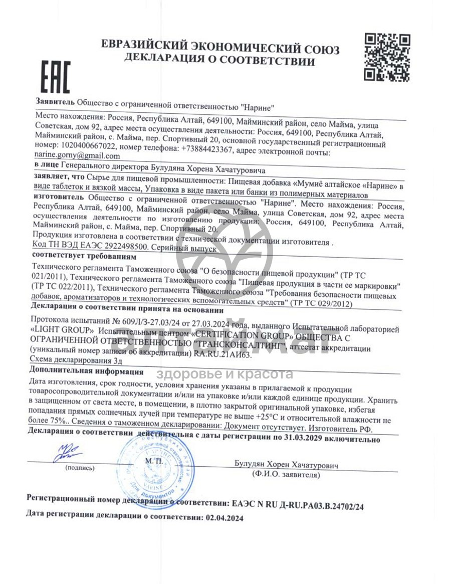 Есть вопросы по товару "Мумие алтайское нарине №20 таблетки"?