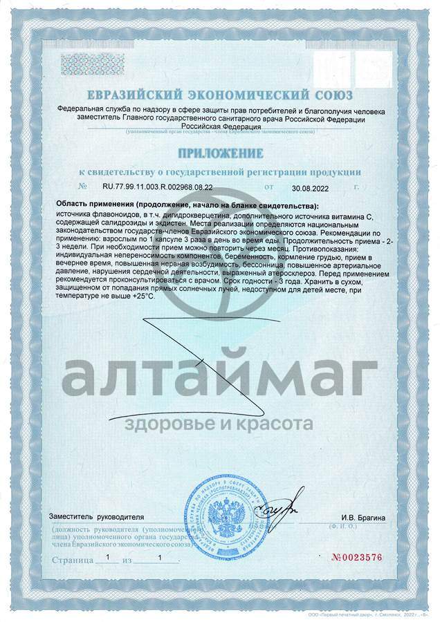 Экстракт травы андрографиса метельчатого, капсула (желатин, краситель диоксид титана), мальтодекстрин, экстракт корней родиолы розовой, экстракт корней копеечника забытого, регулятор кислотности лактат кальция Е327, экстракт корней левзеи сафлоровидной, регулятор кислотности лактат магния Е329, витамин С (L-аскорбиновая кислота), дигидрокверцетин.Рекомендации по применению