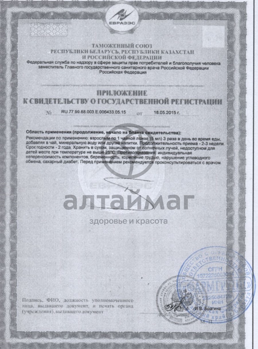 Взрослым — по 1 десертной ложке (10мл) 3 раз в день во время еды, добавляя в чай, минеральную воду или другие напитки. Продолжительность приема −2-3 недели.